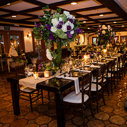 Before it was the home of the Lawrence family, but in 1993 it was transformed into an event space. Since that time it has kept many vintage interior details: a big stone fireplace whose stones were collected from the Aliso creek nearby, stained glass windows, and numerous French doors. The space is great for photography: white stucco walls and ceiling reflect the light well, space does not look dark or low. The room with a terracotta floor also has a place for dancing. The big outdoor patio with a blue-tiled pool and fountain adds to the useful area as well. All this gives a sense of space and light.